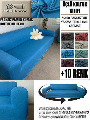 %100 Pamuklu Fransız Kumaş Mavi 3Lü Komple Giydirme Kanepe & Çekyat, Bohem, Porto, Vb. Model Koltuk Kilifi