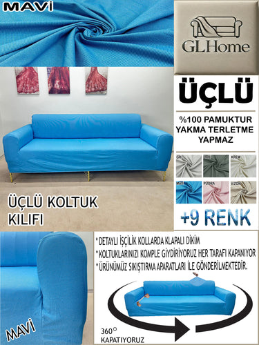 %100 Pamuk Petek Kumaş Mavi 3"Lü Komple Giydirme Kanepe & Çekyat, Bohem, Porto vb Model Koltuk Kılıfları