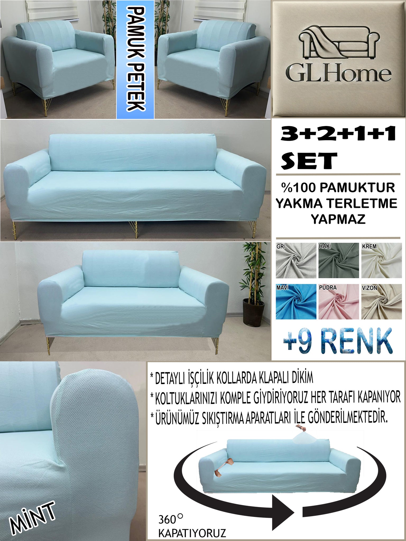 %100 Pamuk Petek Kumaş Mint 3+2+1+1 Set Komple Giydirme Kanepe&Çekyat, Bohem, vb Model Koltuk Kılıfları