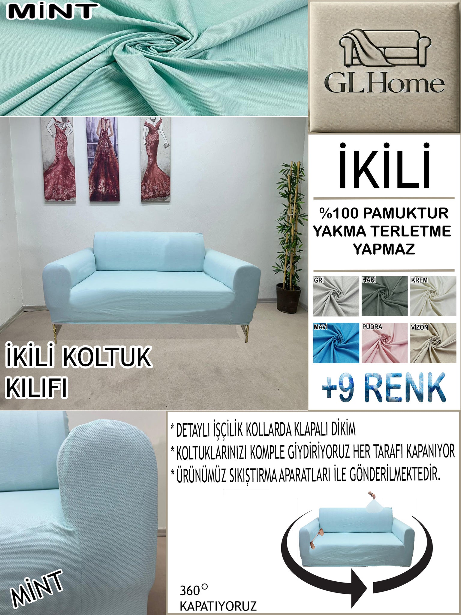 %100 Pamuk Petek Kumaş Mint Çift Kişilik Komple Giydirme 2"Li Kanepe, Bohem, vb Model Koltuk Kılıfları