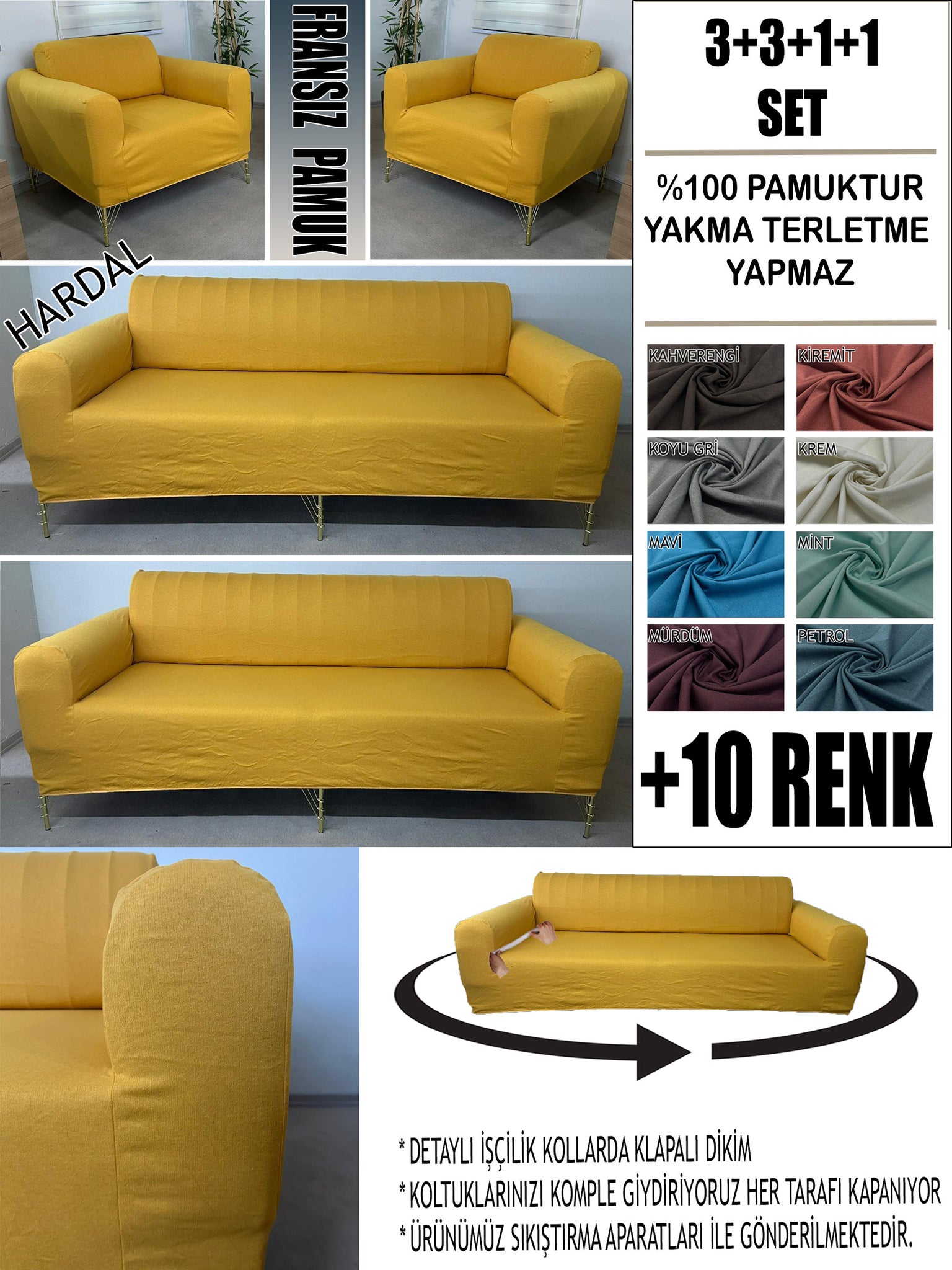 %100 Pamuklu Fransız Kumaş Hardal 3+3+1+1 Komple Giydirme Kanepe&Çekyat, Bohem, Porto, vn. Model Koltuk Kılıfı