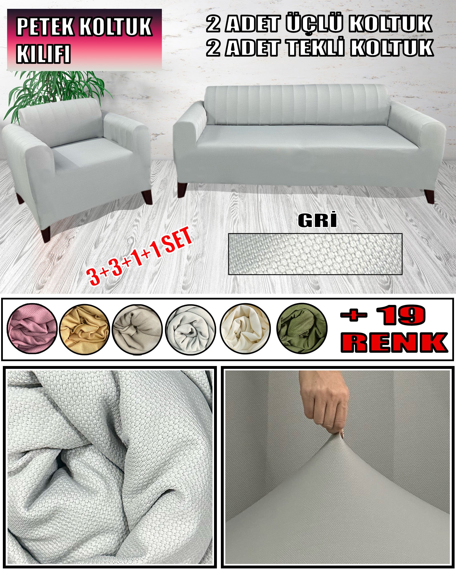 Mikro Petek Kumaş Açık Gri 3+3+1+1 Set Komple Giydirme Kanepe & Çekyat, Bohem, vb Model Koltuk Kılıfları