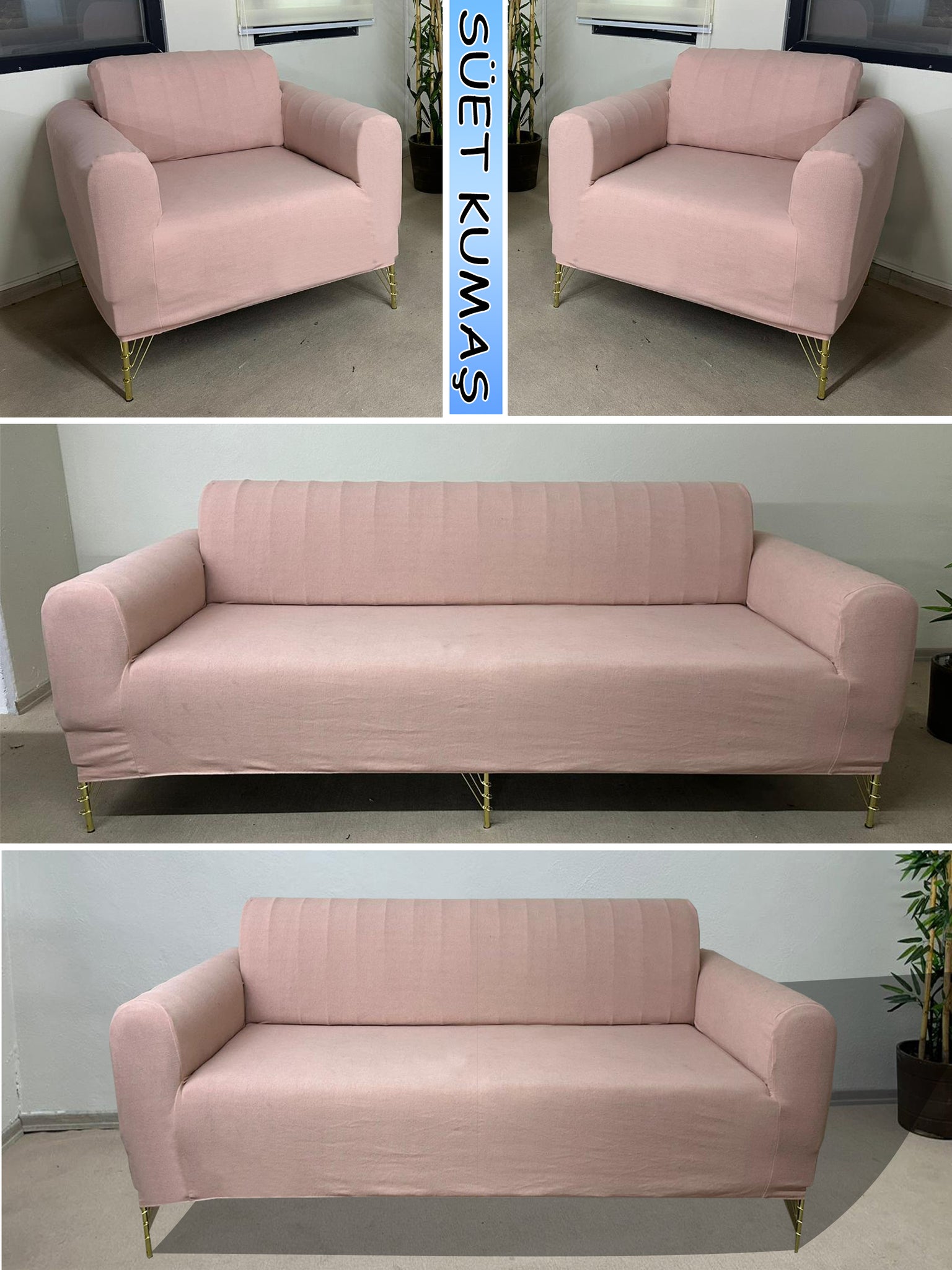 Süet Kumaş Pudra 3+2+1+1 Komple Giydirme Kanepe-Çekyat, Bohem, vb. Model Koltuk Kılıfı