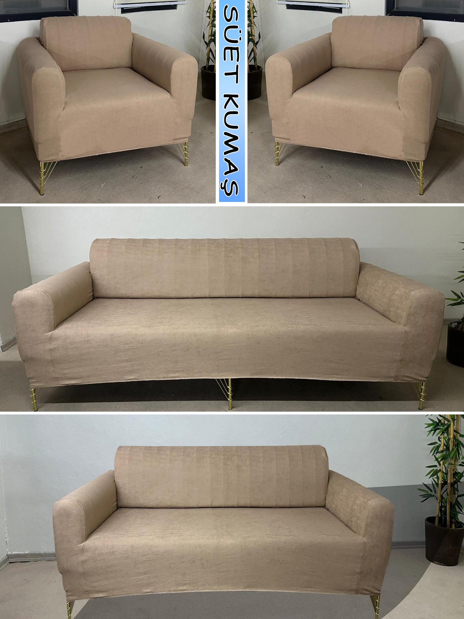 Süet Kumaş Vizon 3+2+1+1 Komple Giydirme Kanepe-Çekyat, Bohem, vb. Model Koltuk Kılıfı